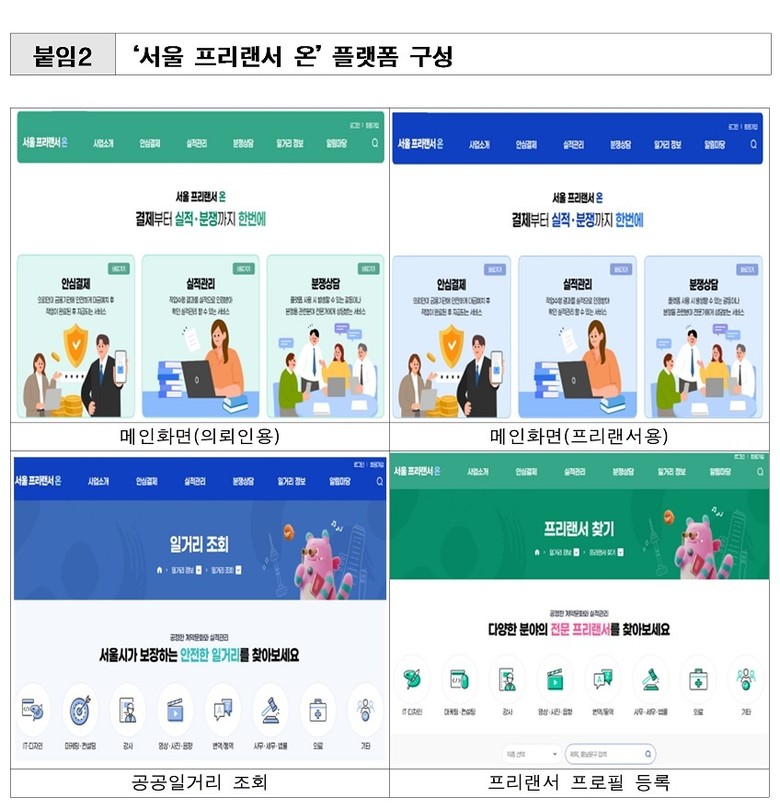 시는 프리랜서의 안심결제, 실적관리, 분쟁상담, 일거리 정보제공까지 한 번에 관리하는 통합 플랫폼 정식 오픈으로 프리랜서가 돈 떼일 걱정 없이 거래하고, 그 과정에서 발생한 실적을 관리하며 보다 안정적으로 일에 집중할 수 있을 것으로 기대한다고 덧붙였다.