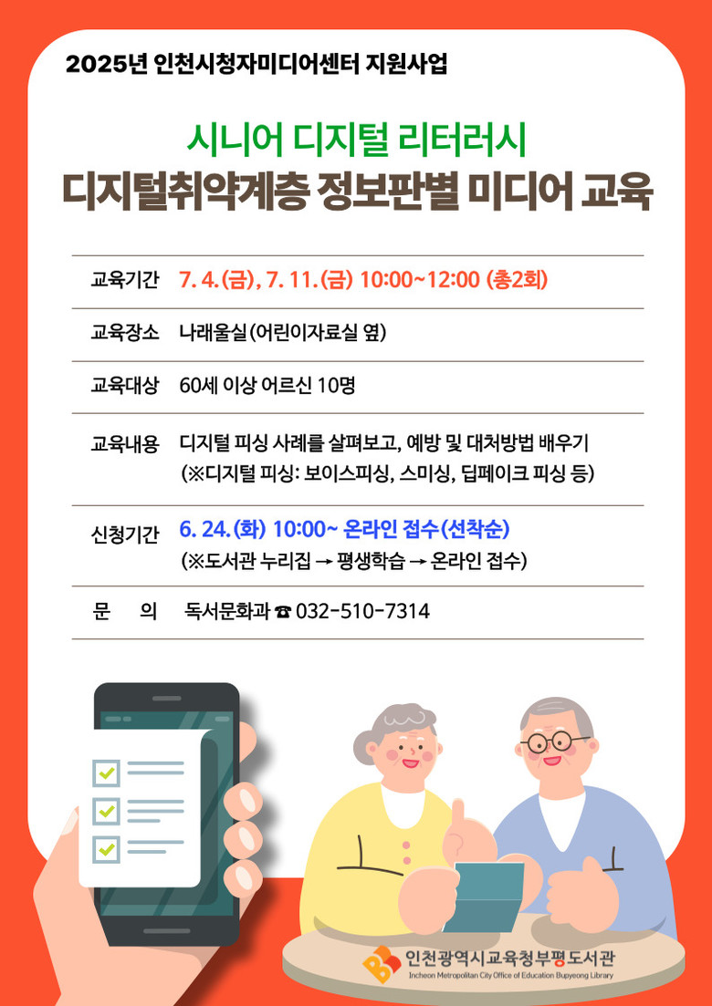 부평도서관 관계자는 “이번 교육이 시니어들의 디지털 정보 판별 능력을 높이고, 일상에서 피해를 예방하는 데 도움이 되길 바란다”며 “디지털 시대의 안전한 생활을 위한 배움의 기회가 되기를 기대한다”고 말했다.