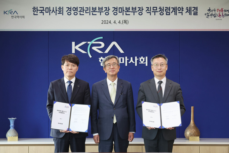 [세계타임즈 = 송민수 기자] 한국마사회 추완호 경영관리본부장과 송대영 경마본부장은 청렴한 조직문화와 윤리경영의 정착에 기여하기 위해 지난 4일 정기환 회장과 직무청렴계약을 체결했다.