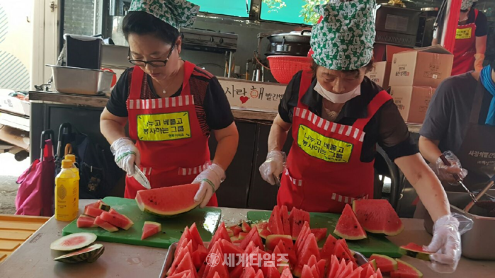 [세계타임즈 심귀영 기자]나누고 베풀고 봉사하는 그룹 소셜 네트워크 서비스 페이스북에 기반을 둔 봉사단체인 나누고 베풀고 봉사하는 행복한 사회를 만들기 위해 나눔 활동을 꾸준히 펼쳐 말복을 맞아 사랑의 빨간밥차 (이선구 이사장)에서 준비한 정성과 사랑이 담긴 삼계탕과 과일 음료수 등을 인천시 부평구 삼산 농수물 도매시장 후원자들에게 삼계탕을 대접해 무더위를 식혔다 .