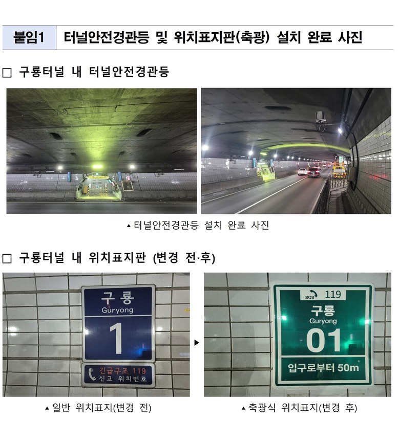 - 구룡터널 기존 위치표지 46개, 암전에도 최대 1시간 발광하는 ‘축광식 위치표지’로 교체