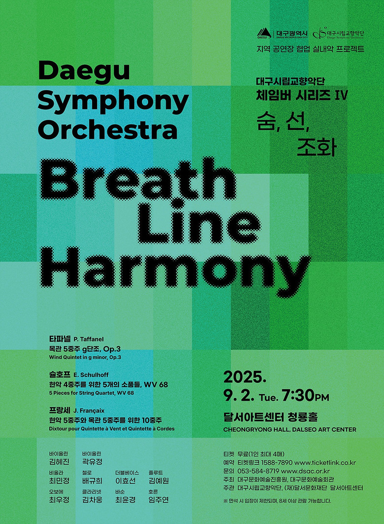 ▸ 목관 5중주와 현악 4중주의 단독 무대에 이어 현악과 목관 10중주로 하모니 [세계타임즈=대구 한윤석 기자] 2025년 대구시립교향악단(이하 대구시향)의 지역 공연장 협업 실내악 프로젝트가 오는 9월 2일(화) 오후 7시 30분 달서아트센터 청룡홀에서 무료로 열리는 ‘체임버 시리즈 Ⅳ : 숨, 선, 조화’를 끝으로 대단원의 막을 내린다.