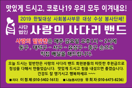 유성구장애인종합복지관 김영근 관장은 “코로나19 상황에서도 장애인들을 위해서 매월1회 맛있는 밑반찬을 지원해주는 사랑의 사다리 밴드 봉사단체에 감사함을 전한다.”고 말했다.