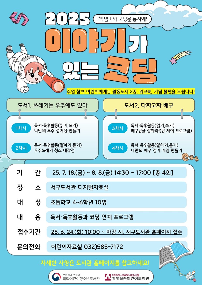 활용 도서로는 ‘쓰레기는 우주에도 있다’와 ‘다짜고짜 배구’가 제공되며, 참가 학생들은 사서와 함께 독후 활동을 진행한 뒤, 전문 강사의 지도로 인공지능 블록 코딩을 활용한 ‘우주 정거장 만들기’, ‘배구 게임 만들기’ 등을 체험하게 된다.