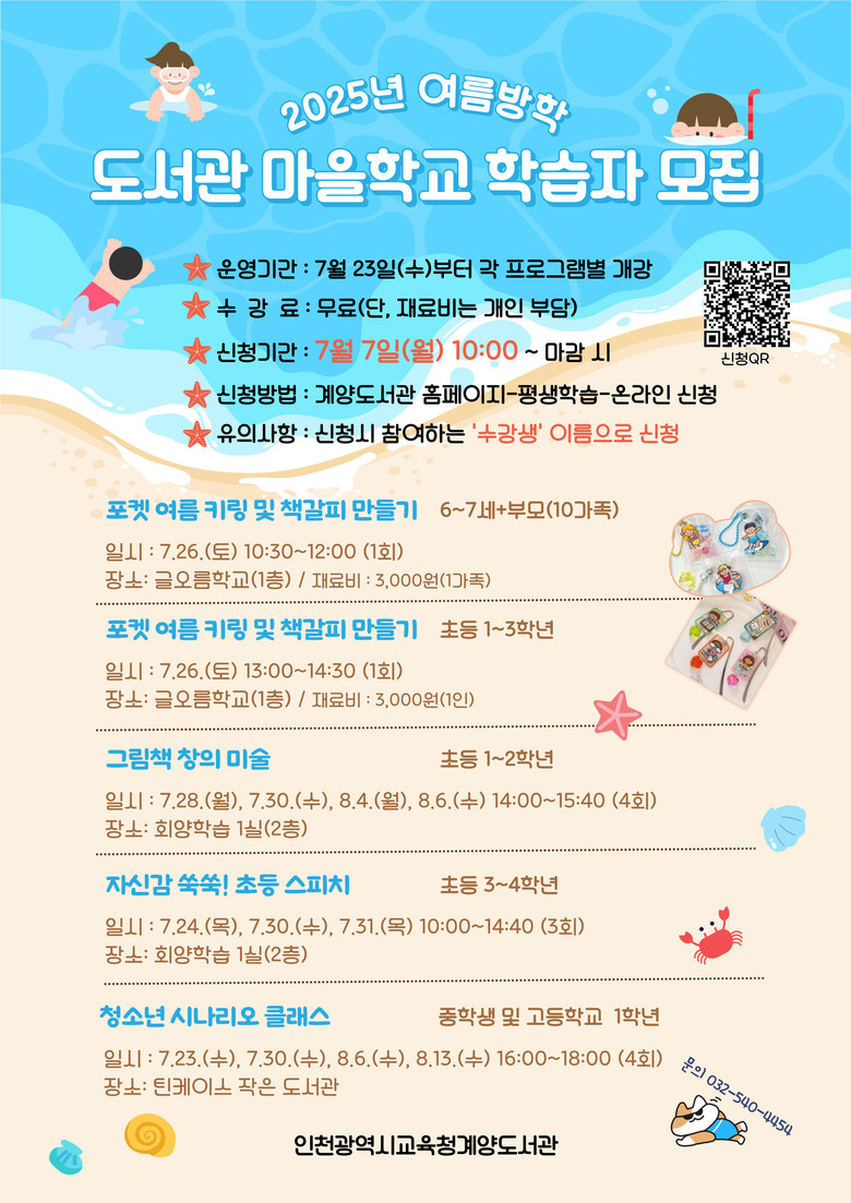 수강 신청은 7월 7일(월) 오전 10시부터 계양도서관 누리집(https://lib.ice.go.kr/gyeyang)에서 선착순 접수하며, 수강료는 무료이고 재료비는 본인 부담이다.