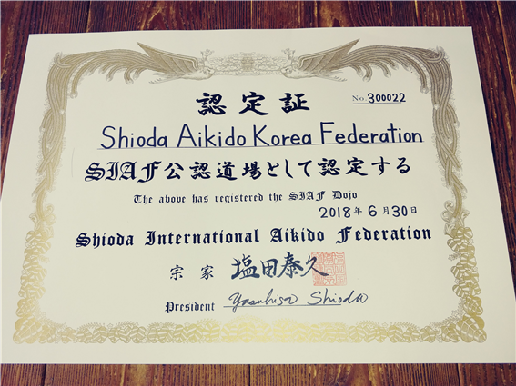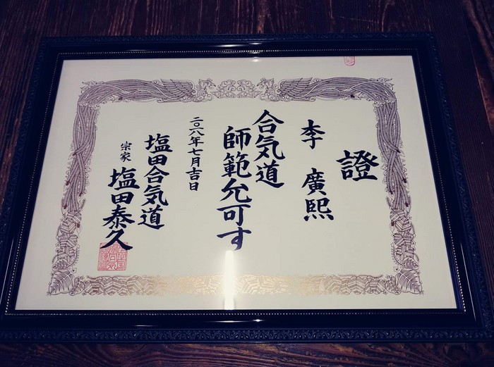 정통합기도의 시오다 야스히사(塩田泰久) 종가에서 사범임명을 받았고 들었다. “올 7월에 정통합기도의 시오다 야스히사(塩田泰久) 종가가 방한했을 때 합기도 6단을 승단을 하고 얼마 후 일본본부에서 본인의 대한 사범임명에 관한 이사회가 열렸으며 만장일치로 통과했다고 연락이 왔었다. 그리고 수일이 지나서 사범임명장이 도착했다.