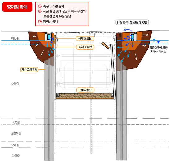 이후 매립층 하부 모래층에서 세굴이 발생하고 균질한 차수그라우팅의 품질을 확보하지 못한 상태에서 굴착 상·하부의 큰 수두차가 발생해, 상대적으로 품질이 저하된 1·2공구 확폭 구간 양쪽으로 전체 토류판이 유실돼 땅꺼짐이 확대된 것으로 보고 있다.