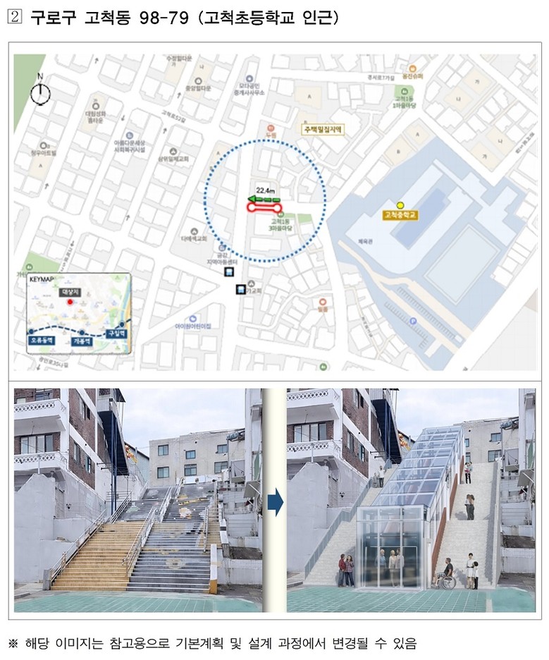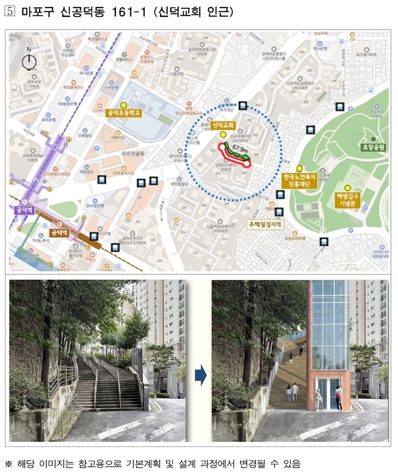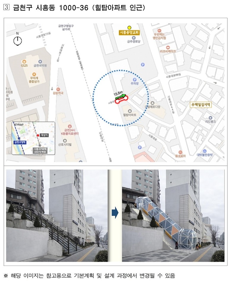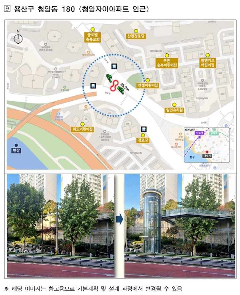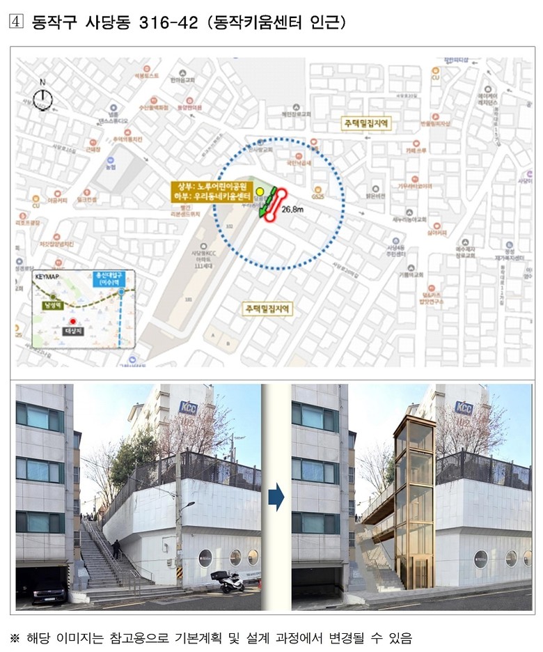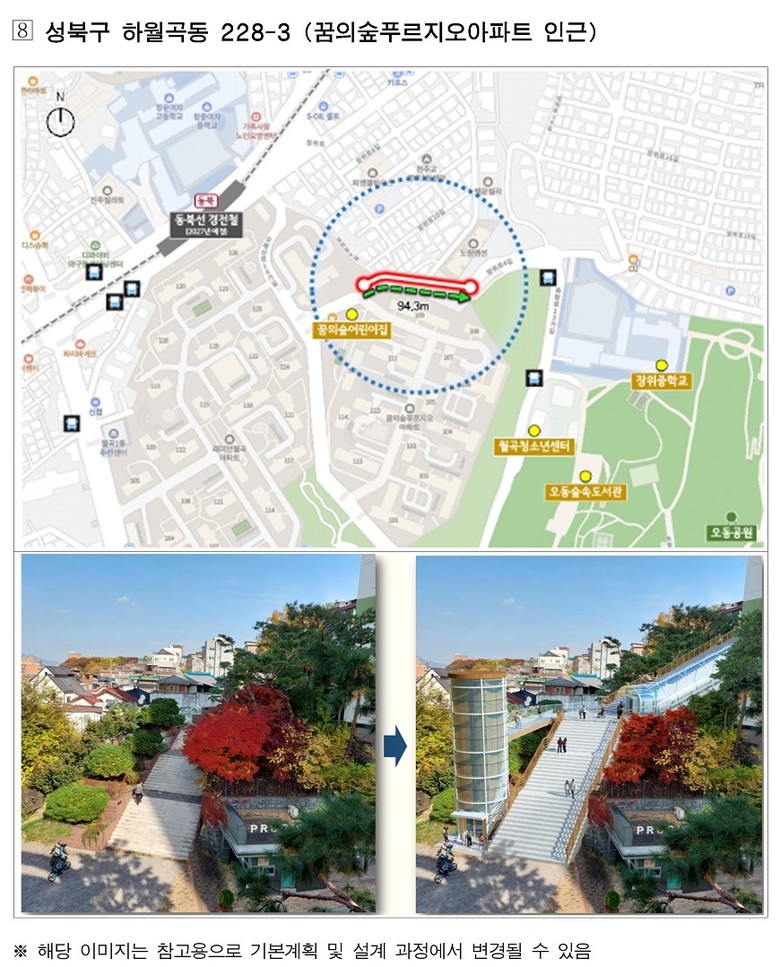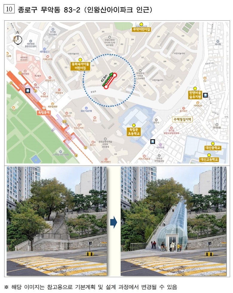대상지에는 지역 특성에 맞춰 수직형·경사형·복합(수직+경사)형 엘리베이터를 설치해 초등학교·지하철역·버스정류장 등의 접근 편의성을 개선하고, 장애인·고령자·어린이 등 이동약자뿐 아니라 일반 시민 누구나 이용할 수 있는 ‘열린 시설’로 조성한다.
