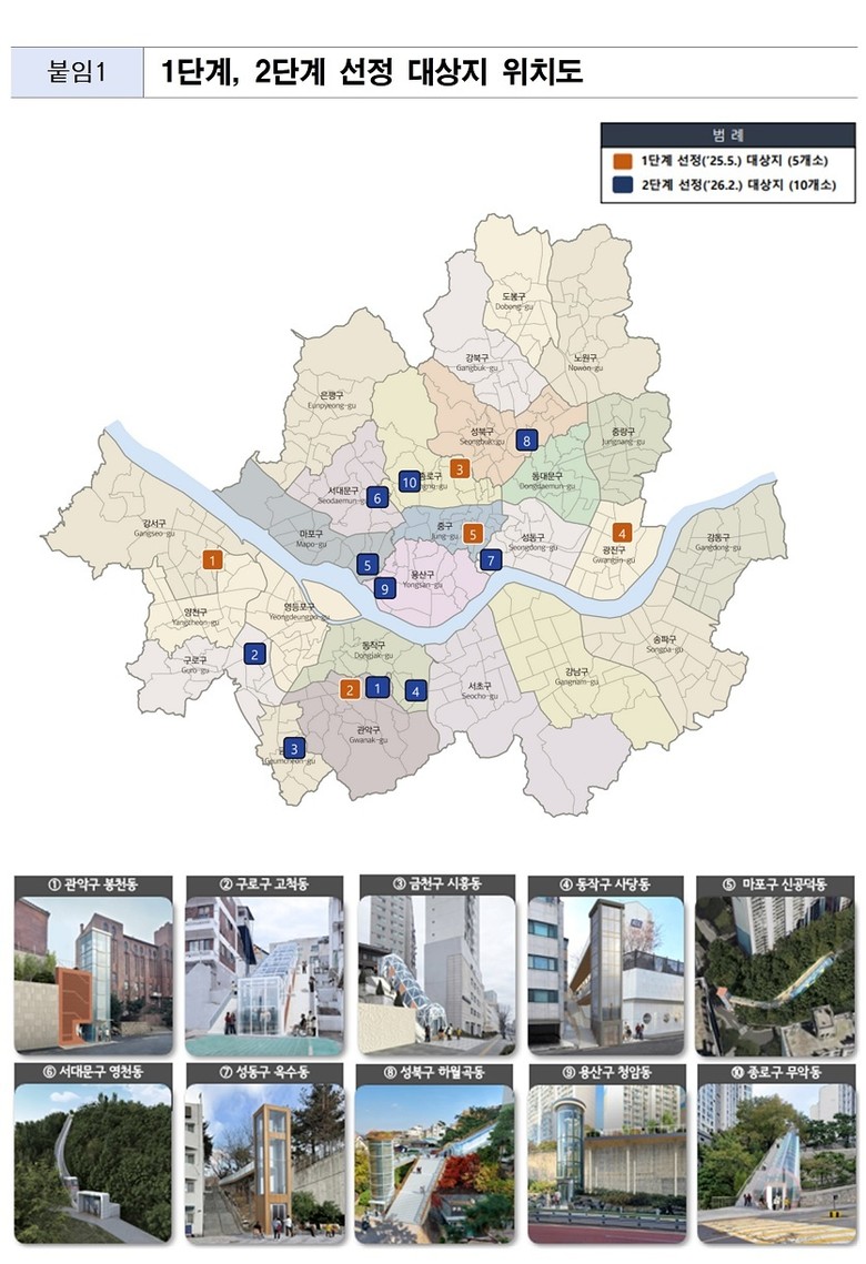 분야별 전문가로 구성된 선정위원회는 접수된 후보지 55곳 가운데 경사도가 30% 이상인 급경사 계단을 중심으로, 이용 수요와 생활 동선 개선 효과가 큰 지역을 검토해 10곳을 선정했다.