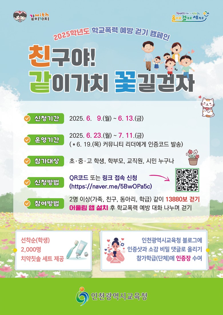 인천시교육청은 이번 캠페인에 이어 하반기에는 ‘같이가치 단풍길 걷자’ 캠페인을 운영해 학교폭력 예방 문화를 지속 확산할 계획이다.