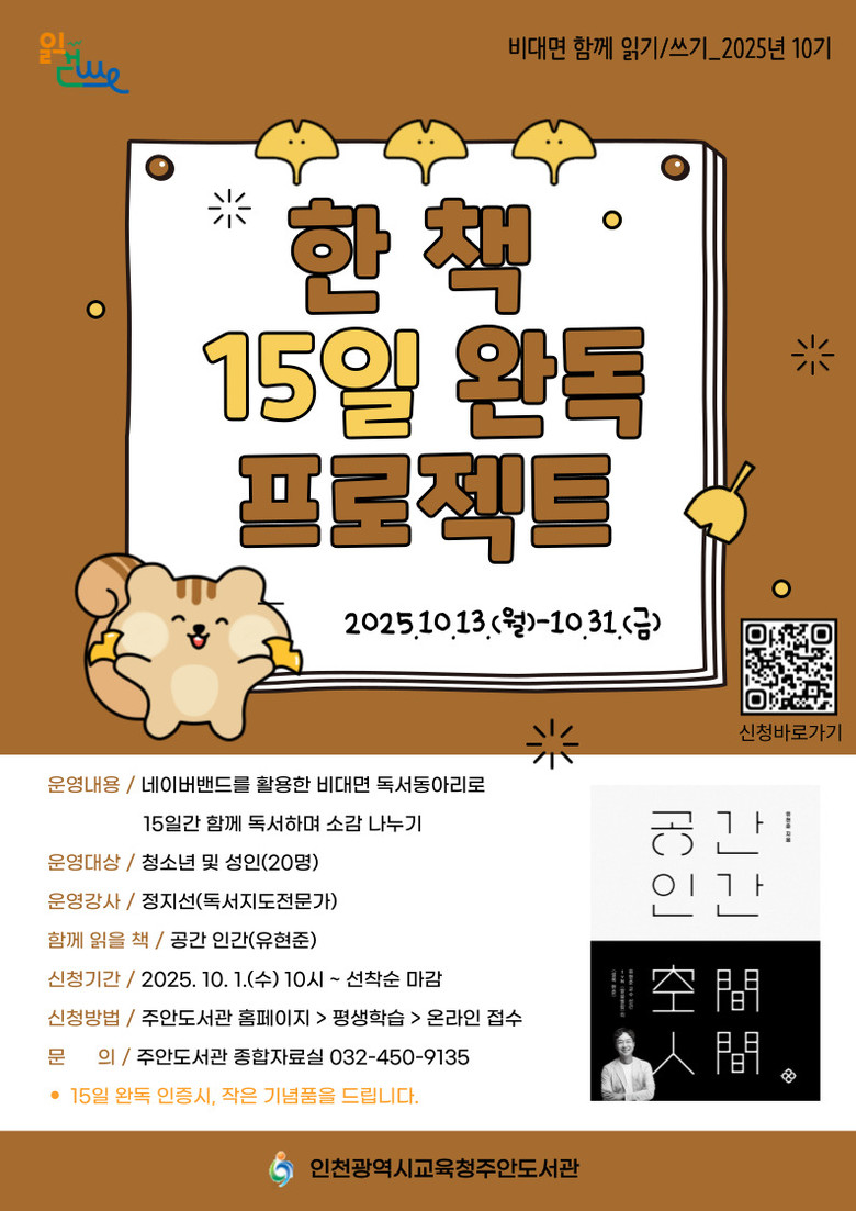 참여 신청은 10월 1일 오전 10시부터 주안도서관 누리집(https://lib.ice.go.kr/juan/index.do)에서 가능하며, 자세한 사항은 종합자료실(☎032-450-9135)로 문의하면 된다.