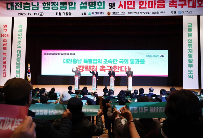 [대전 세계타임즈=이채봉 기자] 대전시는 12일 시청 대강당에서 대전광역시의회, 대전충남 행정통합 민관협의체(이하 민관협)와 공동으로 “대전충남 행정통합 설명회 및 시민 한마음 촉구대회”를 개최하고, 대전충남 행정통합 특별법안의 조속한 국회 심의.의결을 촉구했다.