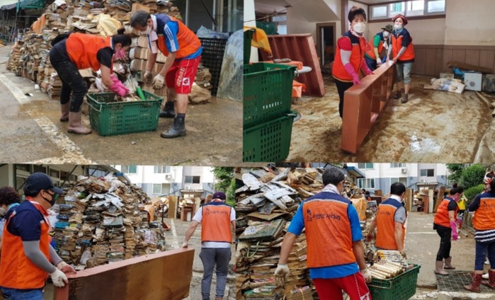 이날 봉사에는 김호찬 단장을 비롯해서 50명의 자원봉사자들이 5팀으로 나누어서 수해복구 봉사에 참여를 하였다.