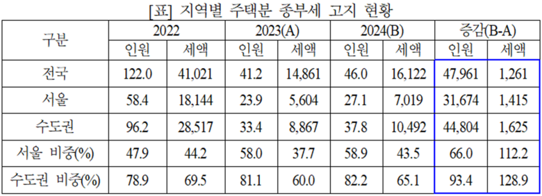 - 고지인원 증가분 수도권에서 93%, 공시가격 15억 초과 주택에서 94% 차지. 고지세액 증가분은 다주택자가 전체의 69%.
