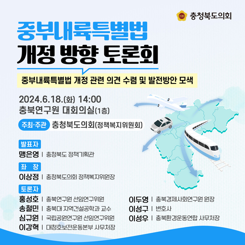 토론회는 주제 발표, 지정토론, 질의응답 순으로 진행된다. 주제 발표는 맹은영 충청북도 정책기획관이 ‘중부내륙특별법 개정 필요성 및 개정 방향’에 대해 설명할 예정이다.