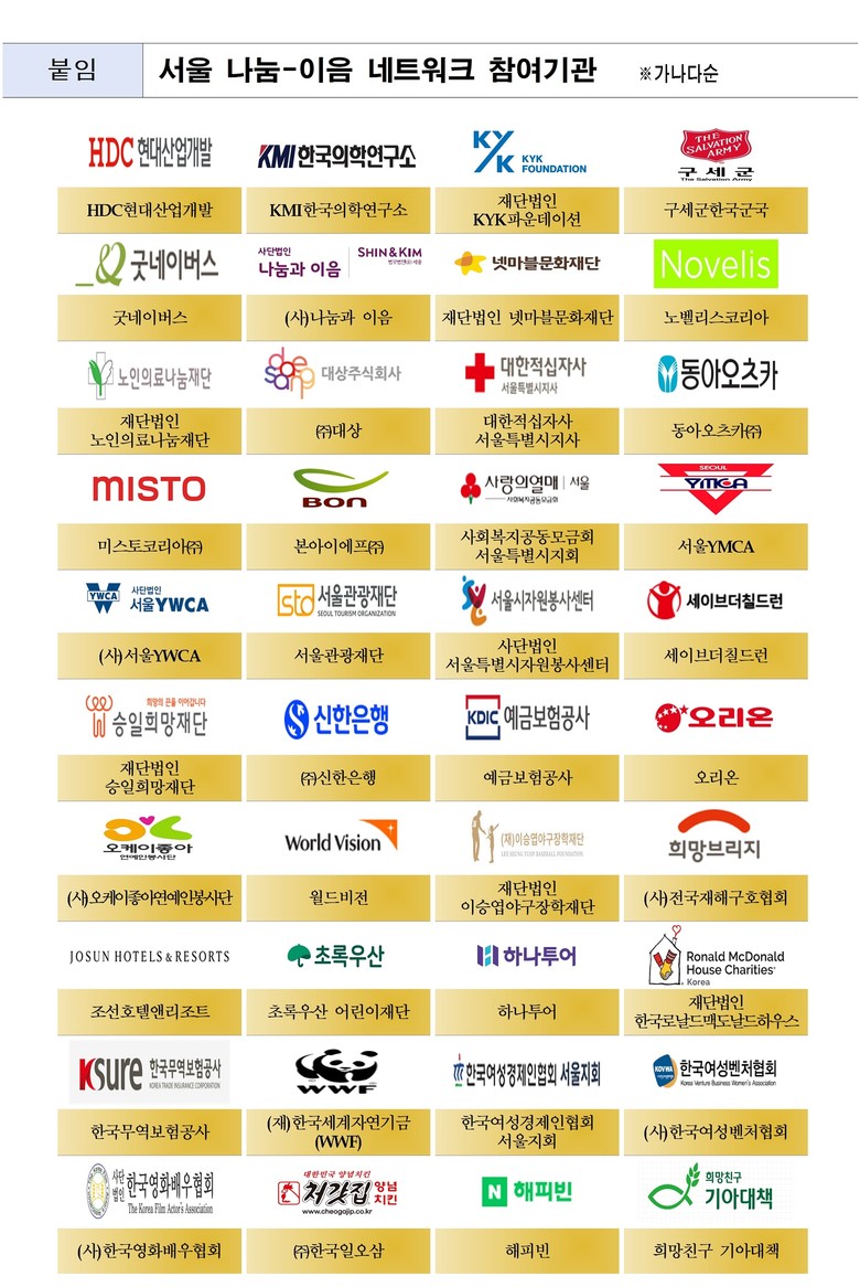 기관‧단체 중에서는 ▴KMI한국의학연구소 ▴재단법인 KYK파운데이션 ▴구세군한국군국 ▴굿네이버스 ▴(사)나눔과 이음 ▴재단법인 넷마블문화재단 ▴재단법인 노인의료나눔재단 ▴대한적십자사(서울특별시지사) ▴사회복지공동모금회(서울특별시지회) ▴(사)서울YWCA ▴서울YMCA ▴서울관광재단 ▴사단법인 서울특별시자원봉사센터 ▴세이브더칠드런 ▴재단법인 승일희망재단 ▴예금보험공사 ▴(사)오케이좋아연예인봉사단 ▴월드비전 ▴재단법인 이승엽야구장학재단 ▴(사)전국재해구호협회 ▴초록우산 어린이재단 ▴재단법인 한국로날드맥도날드하우스 ▴한국무역보험공사 ▴(재)한국세계자연기금(WWF) ▴한국여성경제인협회(서울지회) ▴(사)한국여성벤처협회 ▴(사)한국영화배우협회 ▴해피빈 ▴희망친구 기아대책 등 29개소가 참여했다.