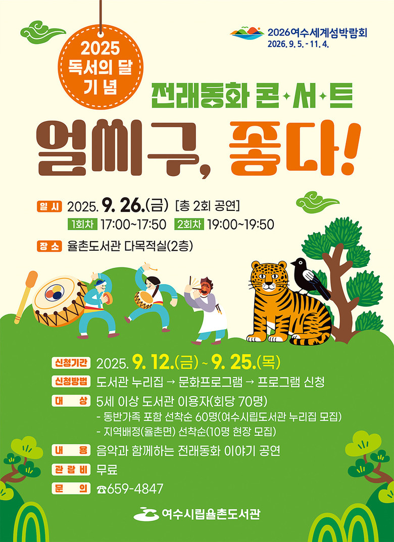 이번 공연은 ‘2025년 여수시립도서관 독서의 달 행사’의 일환으로 마련됐으며 음악과 함께 전래동화를 들려주는 무대로 꾸며진다.