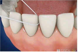 ▲ 치아 사이에 치실을 넣고 치아의 옆면을 따라 위아래로 문질러서 옆면에 붙어 있는 음식물 찌꺼기를 제거한다. 치실을 넣은 상태에서 방향을 바꿔서 옆의 치아도 같은 방식으로 문질러 준다.