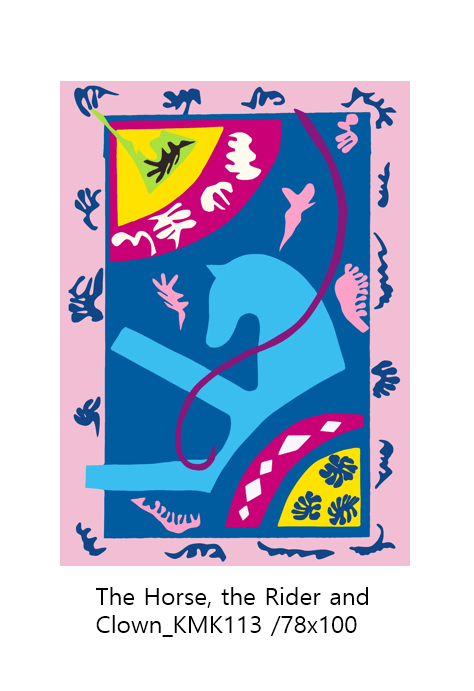 김민경 작가는 앙리 마티스가 1947년 이후의 행복을 주제로 한 생생하고 강렬한 색채로 된 컷아웃 기법의 작품을 재해석한 오마쥬 작품들을 선보이고 있다.