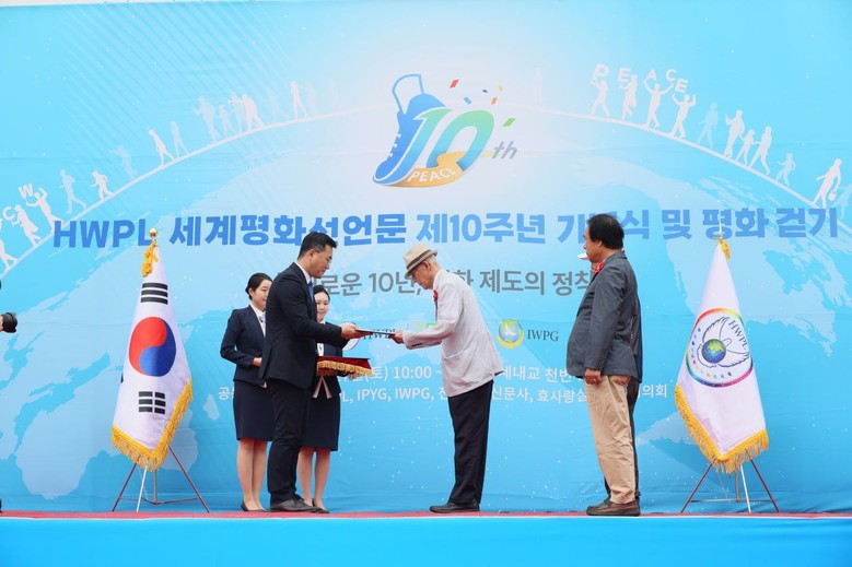 글로벌12지부 평화 걷기대회에 즈음하여 평소 평화활동에 매진한 대한민국 고엽제전우회 정읍지회 김연수 지회장, 대한민국 학도의용군회 중앙회 김창균 회장, 대한민국 6,25참전유공자회 군산시지회 이순성 지회장에게 HWPL 이만희 대표의 평화 감사장이 전해졌다.
