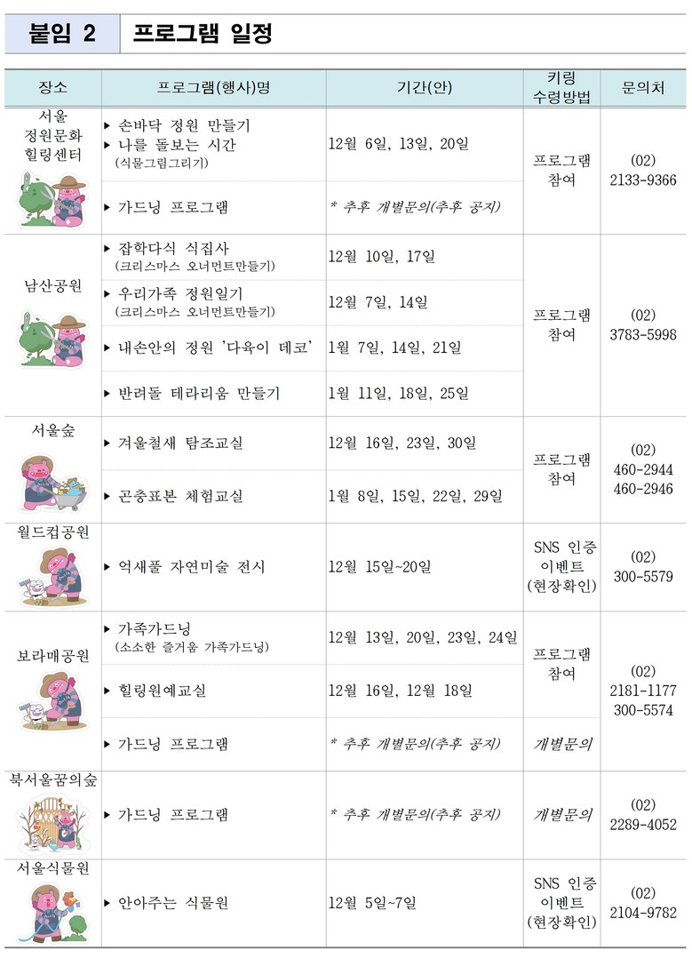 서울시는 오는 12월부터 2026년 1월까지 서울숲, 남산공원, 서울식물원, 월드컵공원, 북서울꿈의숲 등 서울의 주요 공원에서 겨울철 프로그램과 연계한 ‘2025 해치의 겨울정원여행’을 진행한다.