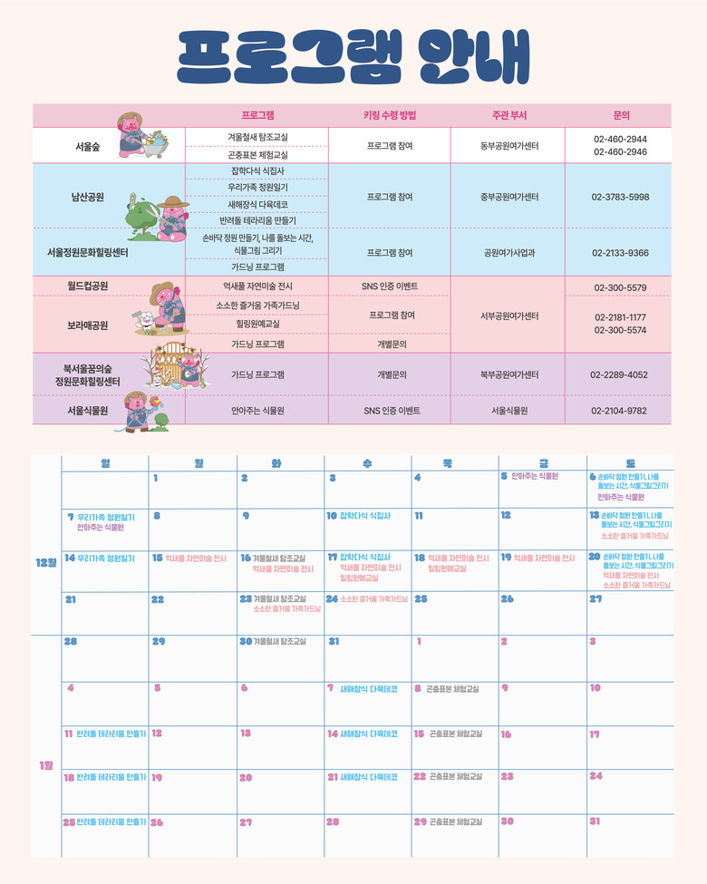 각 공원별 진행 프로그램과 일정, 참여 방법은 ‘서울의 공원’ 누리집(parks.seoul.go.kr)에서 확인할 수 있으며, 예약은 ‘서울시 공공서비스예약’ 누리집(yeyak.seoul.go.kr)을 통해 가능하다.