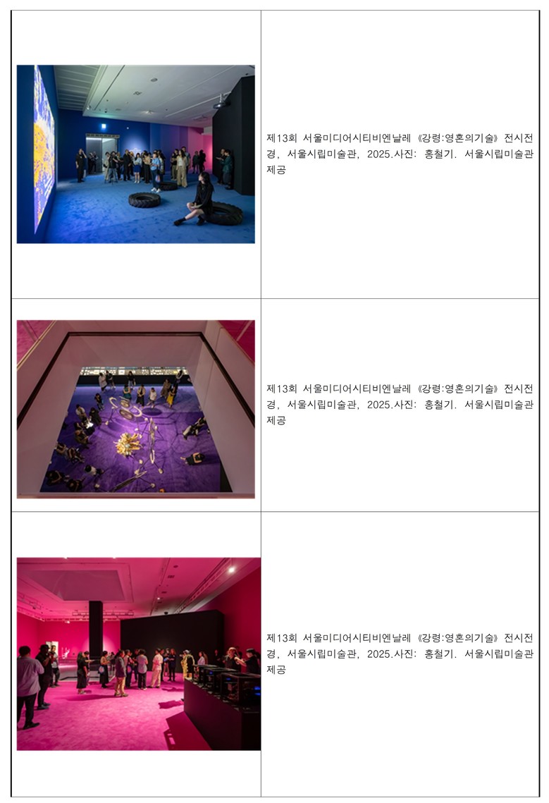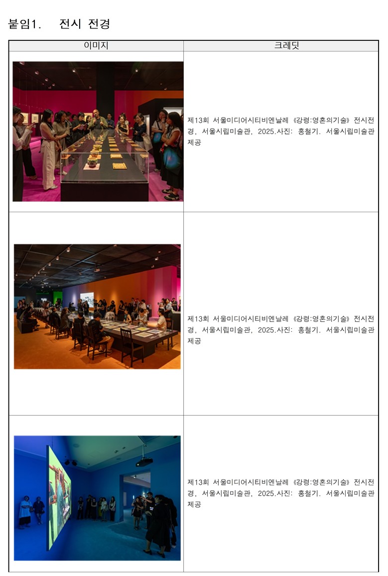 제13회 서울미디어시티비엔날레 《강령: 영혼의 기술》은 지난 8월 26일(화) 개막하여 11월 23일(일)까지 진행되며, 서울시립미술관 서소문본관, 낙원상가, 시네마테크 서울아트시네마에서 전시 중에 있다. 관람객 수는 ‘25.11.4. 기준 10만 5,907명이다.