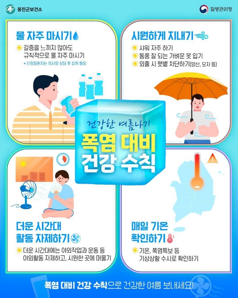 폭염 대비 건강수칙으로는 ▲규칙적인 물 섭취 및 스포츠음료 활용 ▲더운 시간(낮 12시~오후 5시)대에는 활동 자제하기 ▲외출 시 자외선 차단제를 바르고, 챙이 넓은 모자, 부채 등 준비 ▲기상상황 수시 확인(TV, 인터넷, 라디오 등) ▲현기증·메스꺼움 등 이상 증상 발생 시 즉시 그늘에서 휴식 등이다.