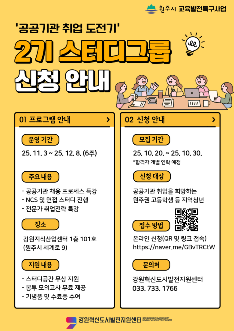 - 필기·면접 대비 그룹 학습, 전문가 취업특강, 공간 지원 등 체계적 지원 [강원도 세계타임즈=김민석 기자] (재)강원혁신도시발전지원센터(센터장 장유진)는 원주시 교육발전특구 위탁사업의 일환으로 ‘공공기관 취업 스터디그룹 2기’를 운영하며, 원주권 청년들의 공공기관 취업 경쟁력 강화를 위한 다양한 실전형 프로그램을 진행한다.