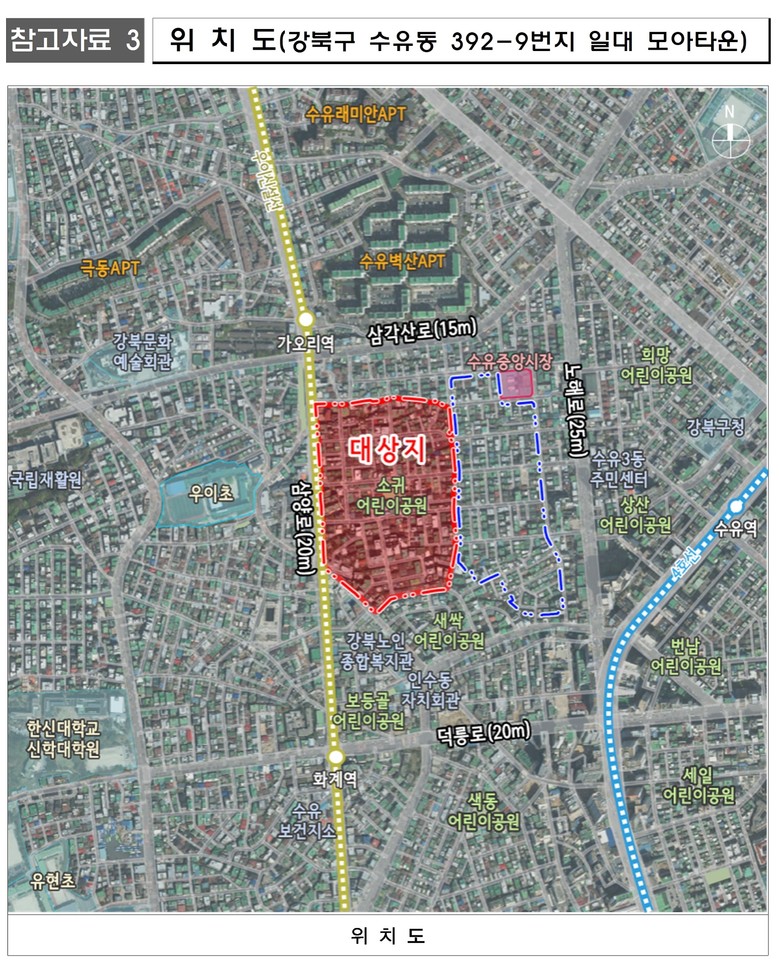 대상지는 반경 600미터 이내 가오리역, 화계역(우이신설선), 수유역(4호선)이 인접해 있는 트리플 역세권이며, 인근에 우이초등학교가 있어 교육환경도 양호하다. 동측으로는 수유동 31-10번지 일대 모아타운이 위치해 이번 사업이 지역 활성화에도 기여할 전망이다.
