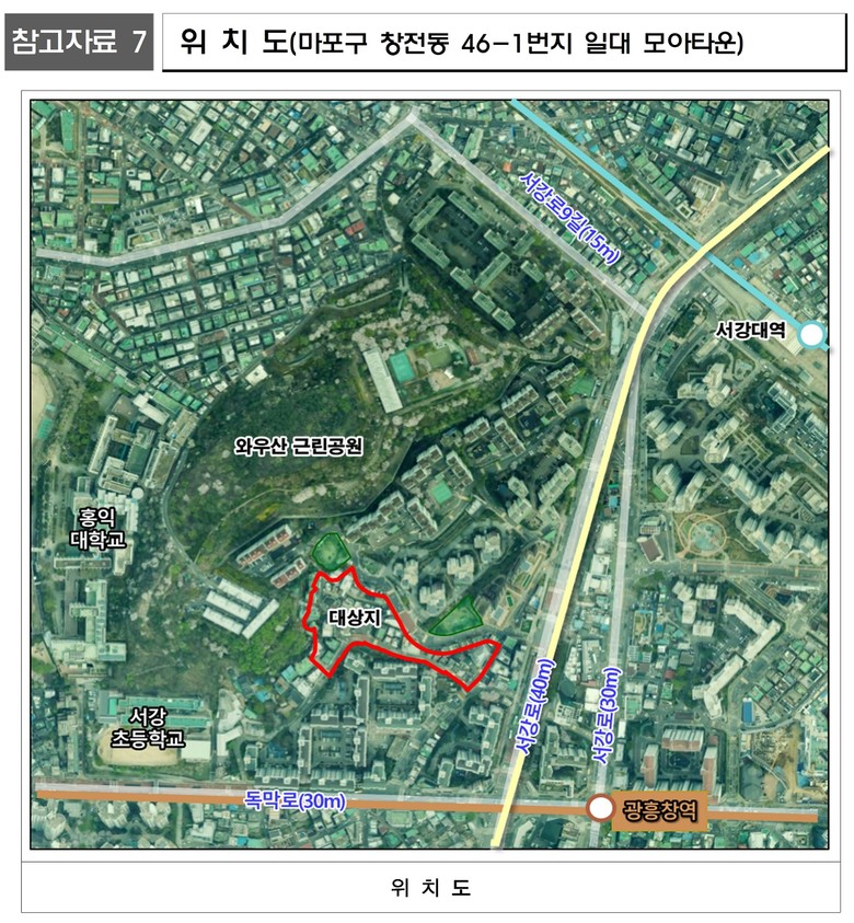 마포구 창전동 46-1번지 일대는 와우산에 인접하고 광흥창역에 가까워 생활환경과 교통이 우수하나, 신축 및 구축 건물이 혼재되어 광역적 개발이 어려워 인접 지역이 재개발되는 동안에도 잔여지로 남은 지역으로, 이번 모아타운 지정을 통해 주민들 간의 소통을 강화하고 쾌적한 주거환경을 조성하여 지역 발전에 기여할 것으로 예상된다.