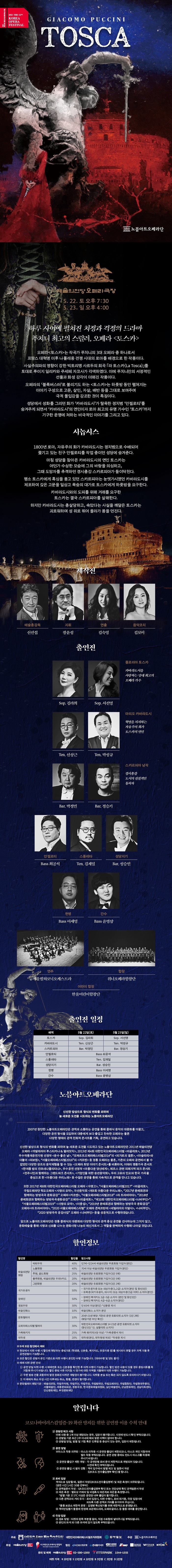 올해(2021년)로 열두 번째를 맞는 대한민국오페라페스티벌이 5월 1일부터 6월 6일까지 약 한 달간 예술의전당과 국립극장에서 펼쳐진다. 올해에 선정된 여섯 편의 작품 중 노블아트오페라단(단장 신선섭)은 <토스카>로 관객들을 찾아갈 예정이다.