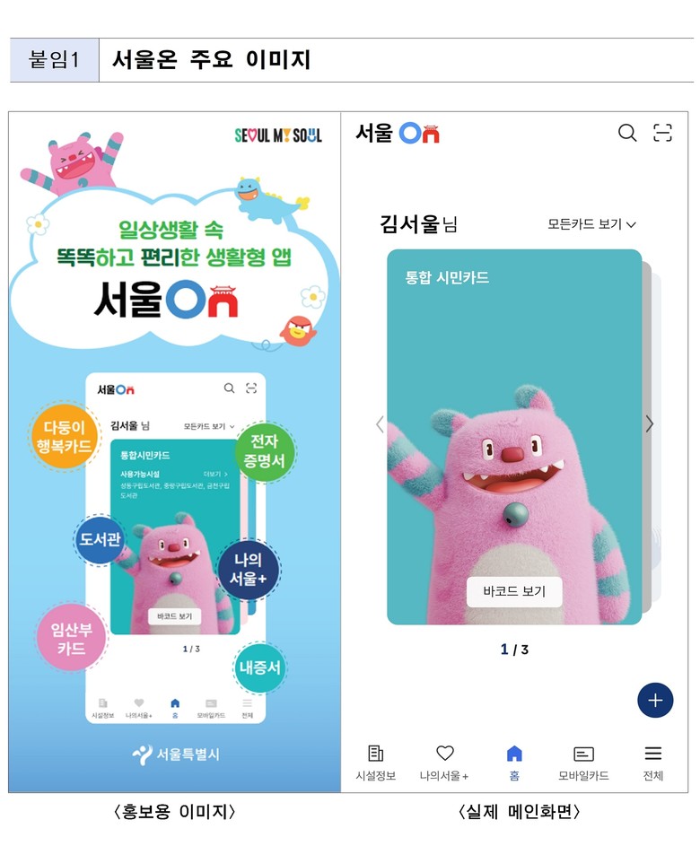 기존에 개별 운영되던 ‘서울지갑’과 ‘서울시민카드’ 앱을 통합한 새 모바일 플랫폼으로 ‘서울온’ 본인 인증 한 번이면 그동안 앱을 각각 설치.가입하고 이용해야 했던 불편이 사라지게 됐다.