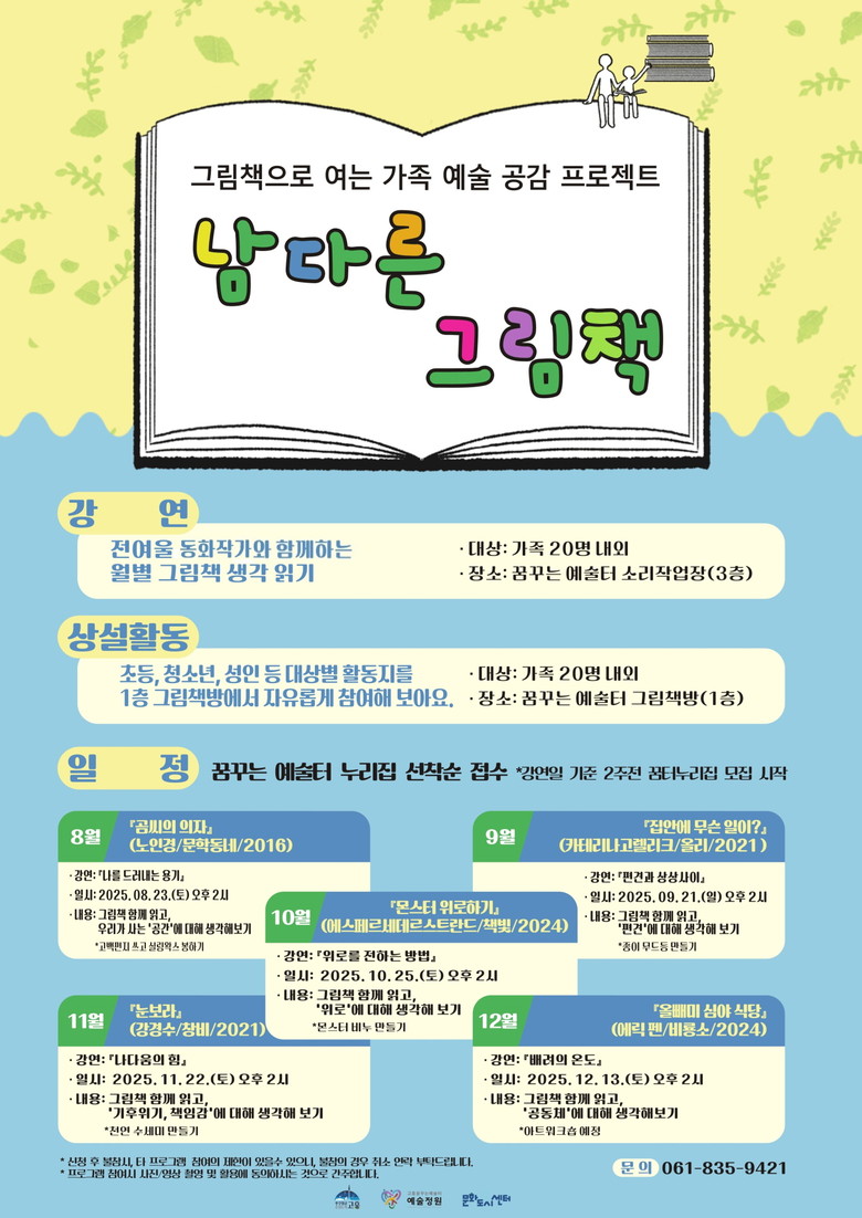 이번 프로그램은 그림책을 매개로 세대 간 소통을 촉진하고 정서적 감수성, 창의력, 소통 능력과 공감력을 높이는 데 목적을 두고 있다. 매월 1회 1권의 도서를 선정해 동화작가 전여울과 함께 강연을 진행하며, 가족 단위 참여자들이 책을 통해 대화를 나누고 생각을 확장할 수 있는 시간을 마련할 계획이다.