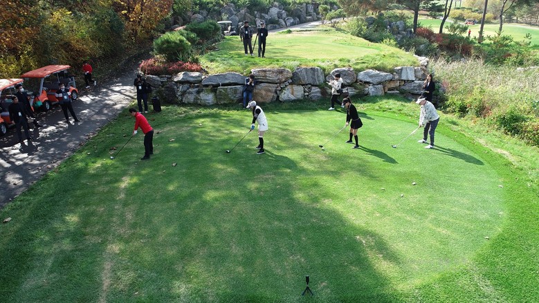 [세계타임즈 = 백진욱 기자] 10월 29일 파주 타이거CC에서 '아주 FUNNY한 골프 대회'가 진행 중인 가운데, 대표 참가자들이 시타를 준비하고 있다.