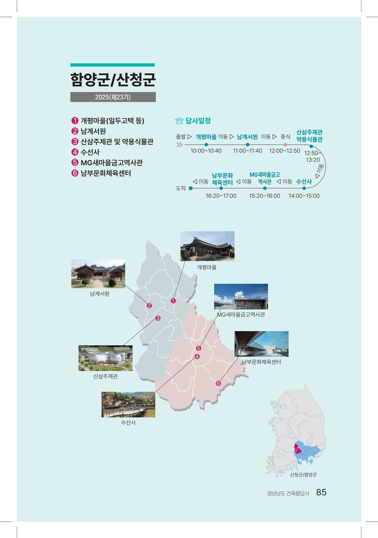 각 답사 코스는 이동 동선과 주요 장소를 체계적으로 정리해, 전문 지식이 없는 도민도 책자를 통해 답사 일정을 따라가며 경남의 건축을 체험할 수 있다. 건축물의 배경과 특징, 공간적 의미도 담아 교육 자료이자 실용적인 안내서로서 활용도가 높다.