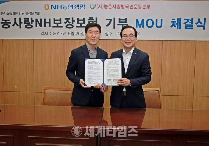 [세계타임즈 김장수 기자] NH농협생명이 20일 오후 서울 서대문 본사에서 ‘농촌사랑범국민운동본부’와 MOU를 체결하고, 26일 출시하는 「농사랑NH보장보험(무)」에 대한 월납환산초회보험료의 10%를 기부하기로 약속했다.