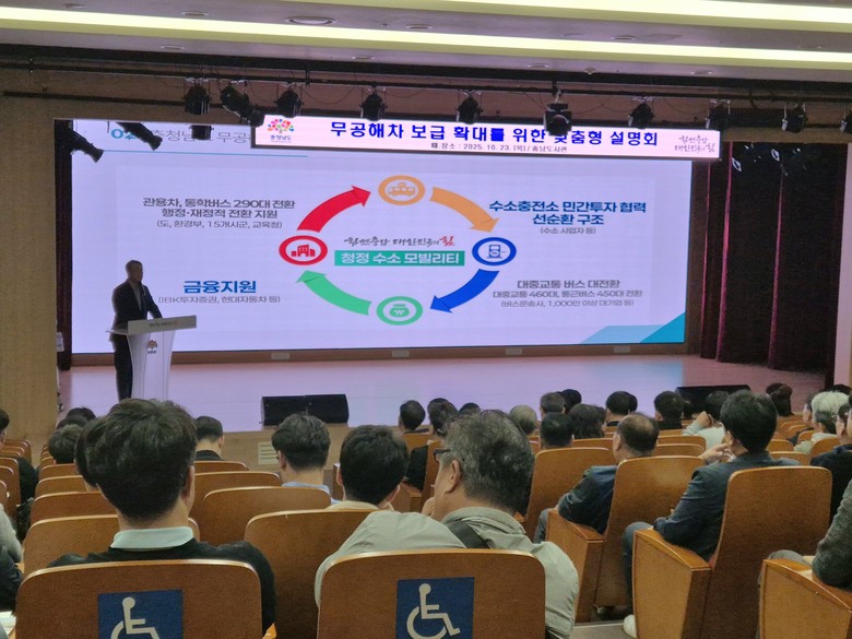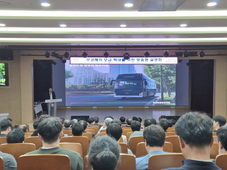 도는 23일 충남도서관 대강당에서 김영명 도 환경산림국장과 시군 공무원, 충남버스운송사업조합, 충남전세버스운송사업조합, 대기업 통근버스 관계자 등 200여 명이 참석한 가운데 ‘무공해차 보급 확대를 위한 맞춤형 설명회’를 개최했다.