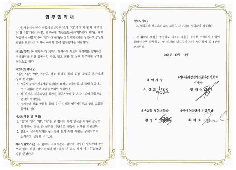 | ▲ 지난 12월 10일 서울시의회 별관에서 개최된 (사)서울시상점가전통시장연합회와 태백시, 태백농협 협동조합, 태백시 농공단지 연합회의 업무협약식(MOU)에서 체결한 업무협약서이다. |