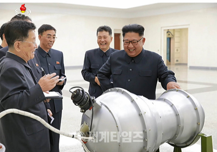 조선중앙TV는 3일 북한 김정은 노동당 위원장이 핵무기연구소를 방문해 관계자들과 함께 화성-14형'의 '핵탄두(수소탄)을 시찰하고 지도하는 모습을 보도했다. 2017.09.03. (사진=조선중앙TV 캡쳐)
