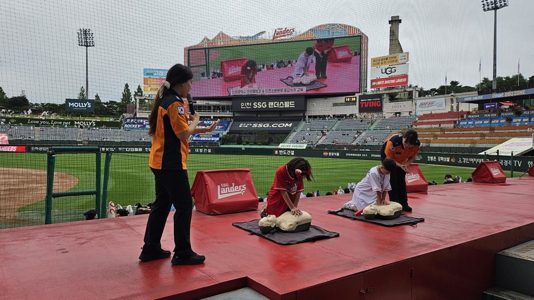 [인천 세계타임즈=심하린 기자] 인천시 시민안전본부 안전예방과 소속 시민재난안전강사 및 소방본부 구급대원들은 지난 19일 인천 SSG랜더스필드에서 열린 SSG 랜더스 홈경기에서 관람객들을 대상으로 심폐소생술 교육을 실시했다.