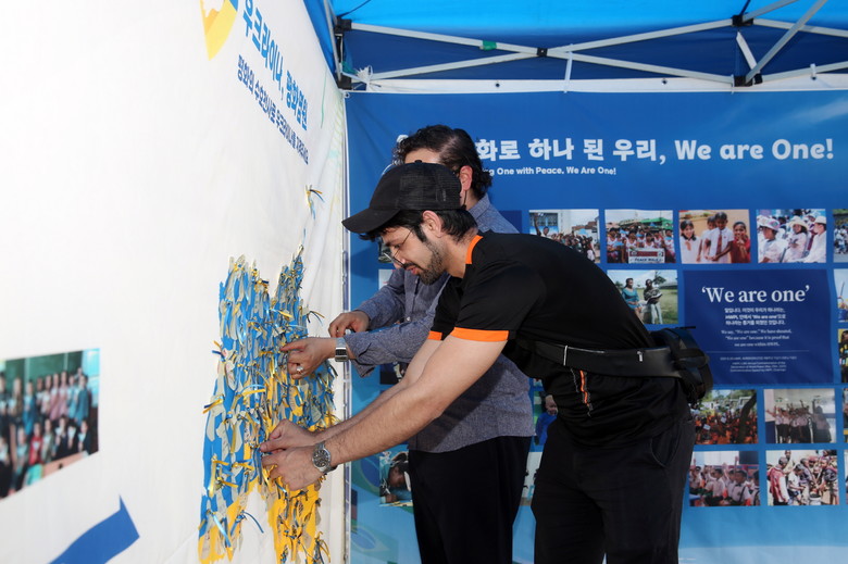 | ▲25일 서울 올림픽공원 평화의광장에서 HWPL 세계평화선언문 제11주년 기념행사가 열린 가운데, 행사에 참석한 외국인들이 우크라이나의 평화를 염원하는 메시지를 담은 메모지를 붙이고 있다. |