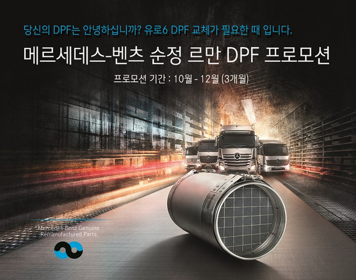[세계타임즈 이영진 기자] 다임러 트럭 코리아(주)가 자사 유로 6 트럭을 구매한 고객들의 DPF(Diesel Particulate Filter) 최초 점검/교체 시기가 도래함에 따라 메르세데스-벤츠 순정 르만 DPF 프로모션을 10월부터 12월까지 3개월 동안 실시한다.