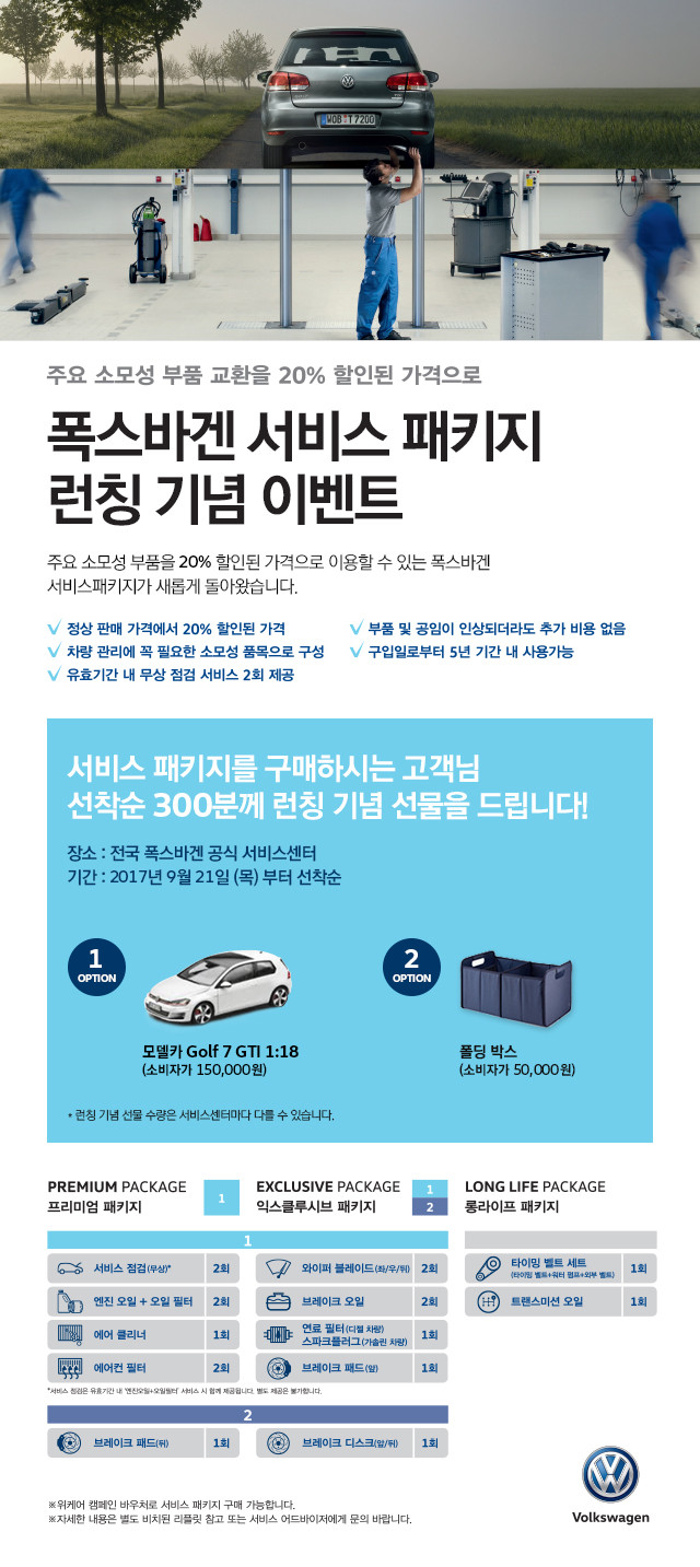 이와 함께 폭스바겐코리아는 서비스 패키지 출시를 기념하여 구매 고객을 대상으로 폭스바겐 순정 액세서리를 선착순 300명에게 증정하는 이벤트를 진행한다(선물 품목 및 수량은 서비스센터 별로 상이).