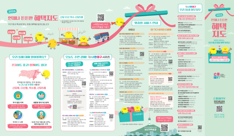 ㅇ 사업별 홈페이지로 연결되는 QR배치해 세부 내용 확인과 신청 가능 [중구 세계타임즈=이장성 기자] 서울 중구가 주민 생활에 필요한 정보를 지역별 특성에 맞춰 담은 ‘2026 언제나 든든한 혜택지도’ 리플릿을 새롭게 선보였다. 이번 리플릿은 기존 생애주기 중심으로 구성했던 ‘내편중구 리플릿’을 한 단계 발전시켜, 중구 15개 동의 지역 특성과 주민 구성에 맞춰 4종의 맞춤형 가이드로 세분화했다.