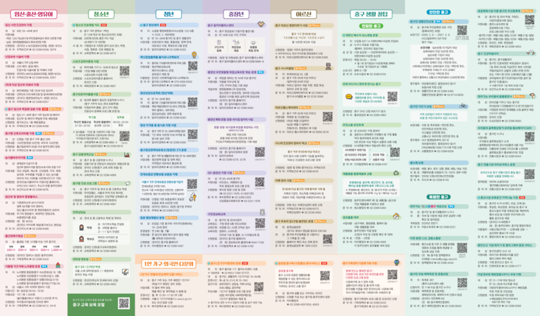 리플릿은 앞면에는 동별 특성을 반영한 맞춤형 정보를, 뒷면에는 중구 전체의 생애주기별 혜택을 한눈에 확인 할 수 있도록 구성했다.