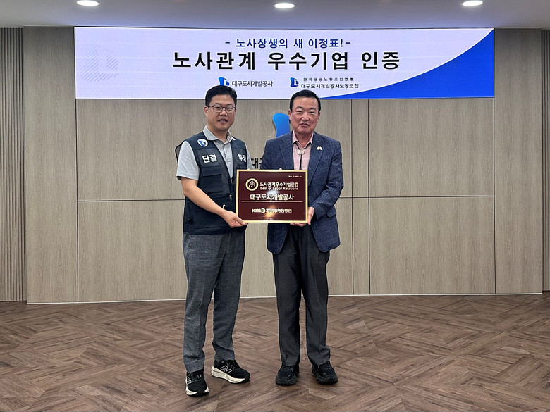 천상필 대구도시개발공사노동조합 위원장도 “서로 존중하고 신뢰하는 문화가 이번 인증을 통해 다시 한번 인정받게 됐다”며, “앞으로도 노사가 함께 소통하고 발전하는 관계를 만들어 가겠다”고 강조했다.