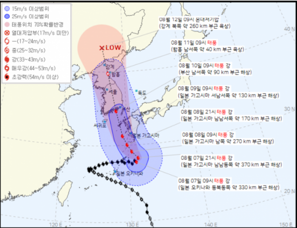 기상청은 7일 브리핑을 통해 이날 오전에 일본 오키나와 부근의 해상을 통과한 후 곧바로 북동쪽으로 올라오다가 저녁에 북서쪽으로 이동방향을 틀면서 북진을 거듭해 최종적으로 10일 오전 9시 부산 해상에 다다를 것이라고 전망했다.
