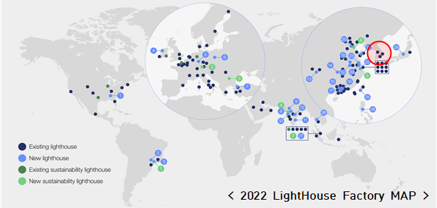 ‘글로벌 등대(Global Lighthouse Network)’는 어두운 밤하늘에 등대가 빛을 밝혀 길을 안내하듯 인공지능, 빅데이터 분석 등 4차 산업혁명의 핵심기술을 적극 도입하여 세계 제조업의 미래를 선도하는 기업을 의미하며, 세계경제포럼이 2018년부터 전 세계 기업의 생산시설을 심사해 매년 선발하고 있다.