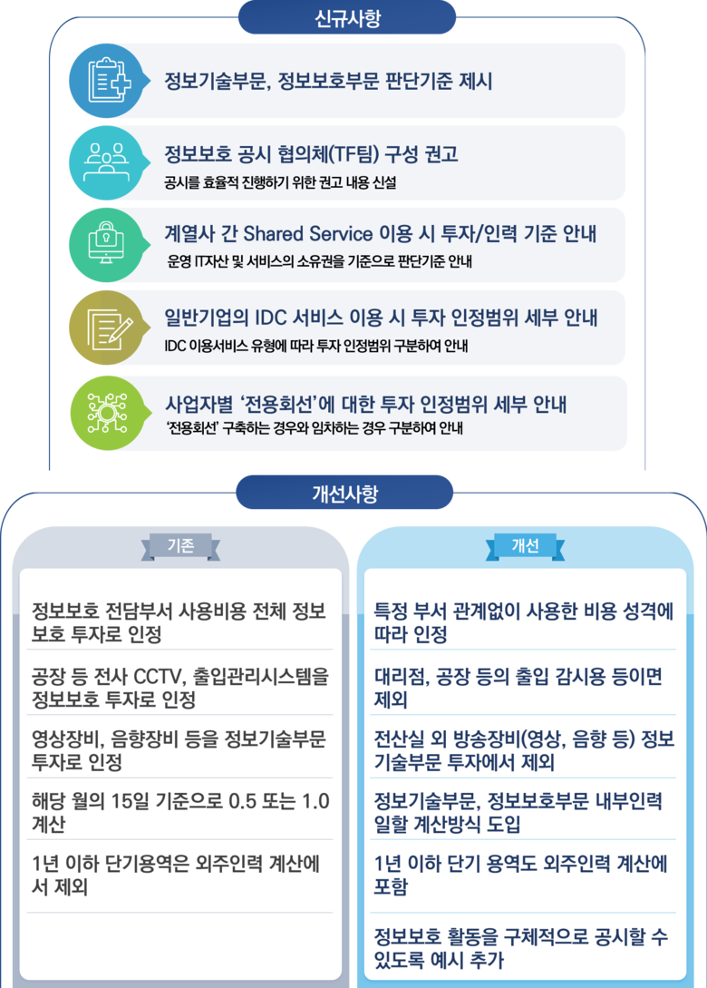 이번 가이드라인은 기업의 개별 자산 및 비용이 ‘정보기술부문’, ‘정보보호부문’ 투자에 해당하는지 판단할 수 있도록 기준을 제시하고, 기업들이 보다 쉽게 정보보호 공시에 참여할 수 있도록 정보보호 투자, 인력 산출 방법 등을 상세히 정리하여 담았다.